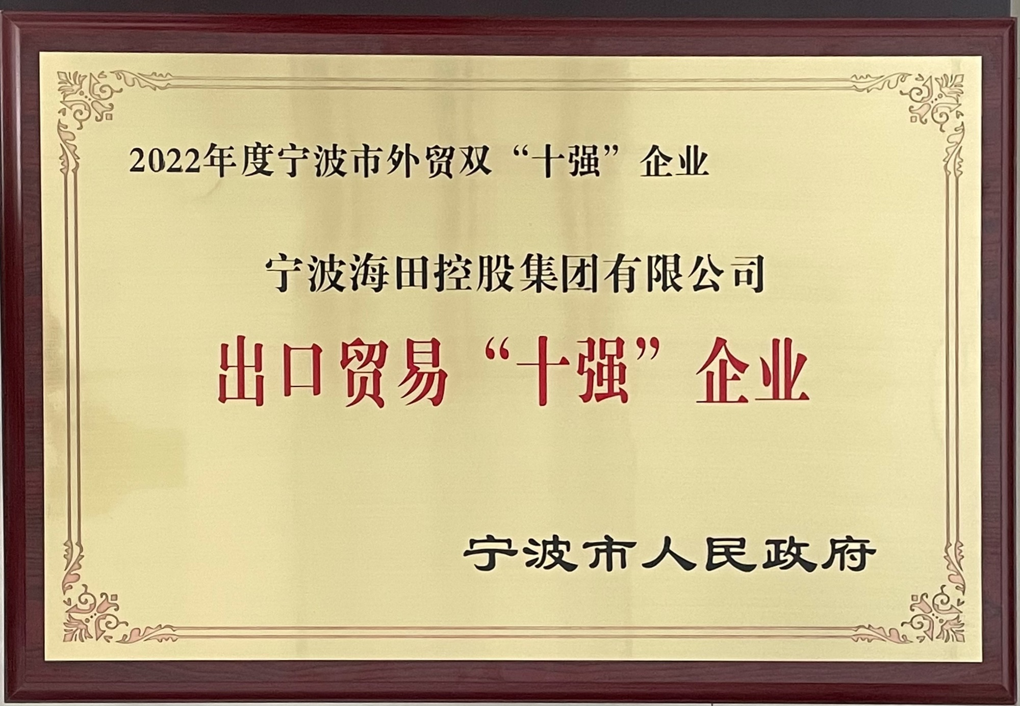 寧波海田控股集團榮獲2022年寧波市出口貿易“十強”企業(yè)
